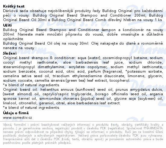 Dárková sada obsahuje nejoblíbenější produkty řady Bulldog Original pro každodenní péči o vousy: Bulldog Original Beard Shampoo and Conditioner 200ml, Bulldog Original Beard Oil 30ml a Bulldog Original Beard Comb dřevěný hřeben na vousy 1 ks