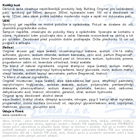Dárková sada obsahuje nejoblíbenější produkty řady Bulldog Original pro každodenní péči: sprchový gel 500ml, šampon 300ml, hydratační krém 100 ml a deodorant ve spreji 125ml. Jako dárek potěší každého moderního muže a zajistí mu dokonalou péči.