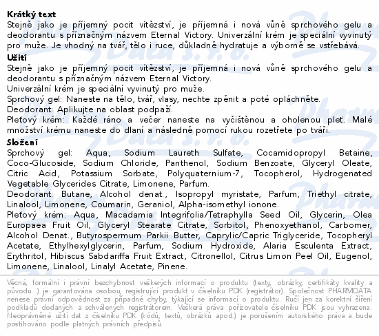 Stejně jako je příjemný pocit vítězství, je příjemná i nová vůně sprchového gelu a deodorantu s příznačným názvem Eternal Victory. Univerzální krém je speciální vyvinutý pro muže. Je vhodný na tvář, tělo i ruce, důkladně hydratuje a výborně se vstřebává.