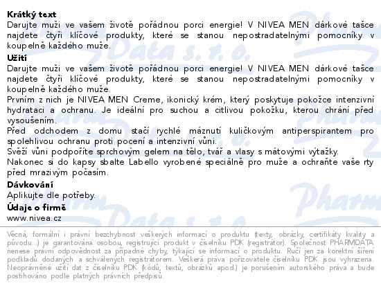 Darujte muži ve vašem životě pořádnou porci energie! V NIVEA MEN dárkové tašce najdete čtyři klíčové produkty, které se stanou nepostradatelnými pomocníky v koupelně každého muže.