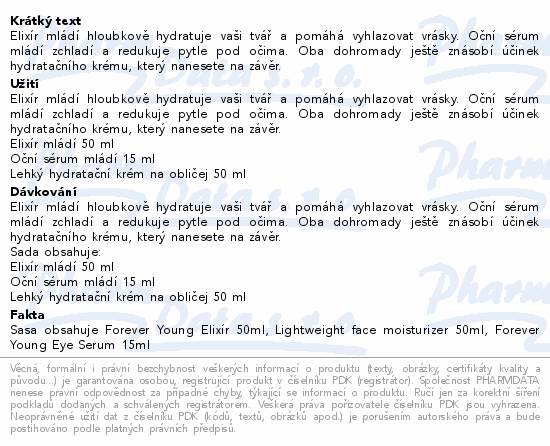 Elixír mládí hloubkově hydratuje vaši tvář a pomáhá vyhlazovat vrásky. Oční sérum mládí zchladí a redukuje pytle pod očima. Oba dohromady ještě znásobí účinek hydratačního krému, který nanesete na závěr.