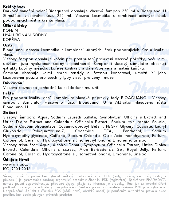 Dárkové vánoční balení Bioaquanol obsahuje Vlasový šampon 250 ml a Bioaquanol U Stimulátor vlasového růstu 250 ml. Vlasová kosmetika s kombinací účinných látek podporujících růst a kvalitu vlasů.