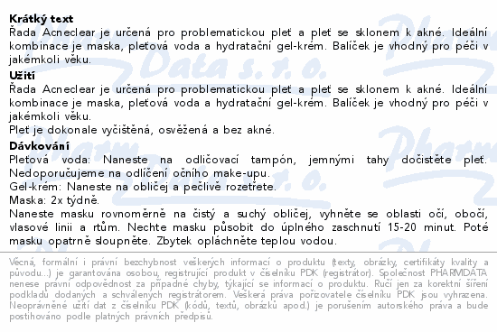 Řada Acneclear je určená pro problematickou pleť a pleť se sklonem k akné. Ideální kombinace je maska, pleťová voda a hydratační gel-krém. Balíček je vhodný pro péči v jakémkoli věku.