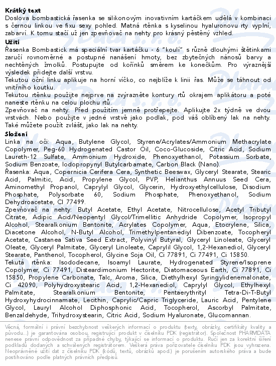 Doslova bombastická řasenka se silikonovým inovativním kartáčkem udělá v kombinaci s černou linkou ve fixu sexy pohled. Matná rtěnka s kyselinou hyaluronovu rty vyplní, zabarví. K tomu stačí už jen zpevňovač na nehty pro krásný pěstěný vzhled.