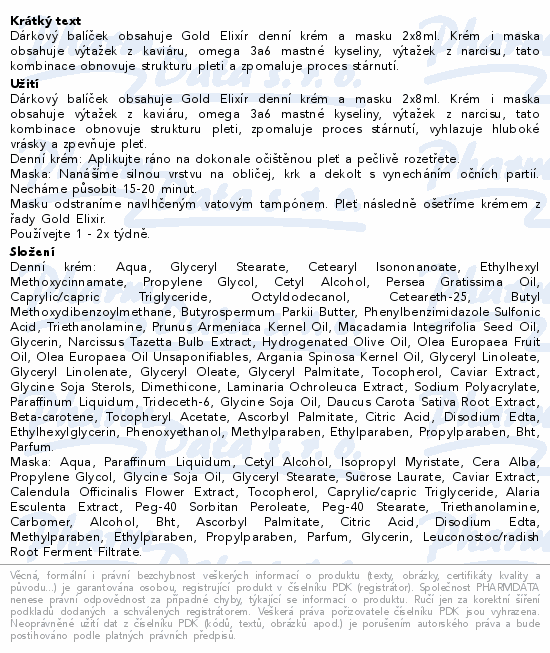 Dárkový balíček obsahuje Gold Elixír denní krém a masku 2x8ml. Krém i maska obsahuje výtažek z kaviáru, omega 3a6 mastné kyseliny, výtažek z narcisu, tato kombinace obnovuje strukturu pleti a zpomaluje proces stárnutí.