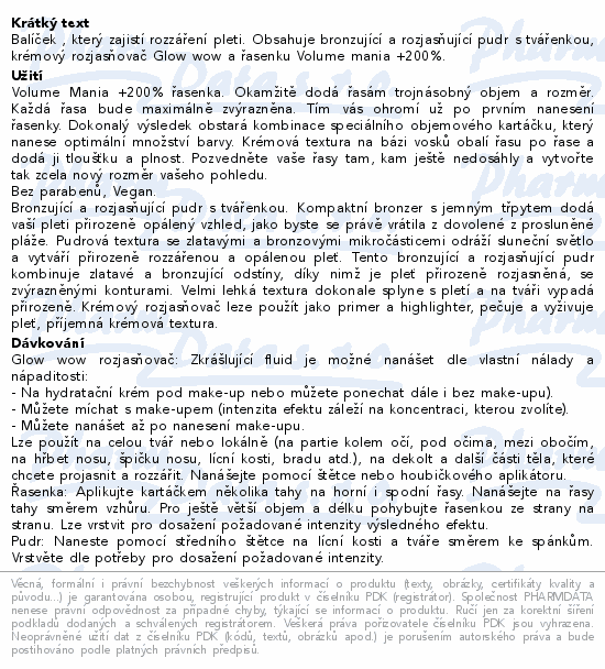 Balíček , který zajistí rozzáření pleti. Obsahuje bronzující a rozjasňující pudr s tvářenkou, krémový rozjasňovač Glow wow a řasenku Volume mania +200%.