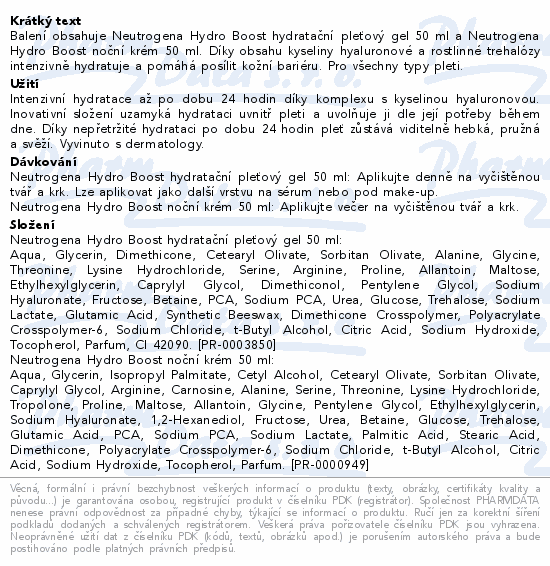 Balení obsahuje Neutrogena Hydro Boost hydratační pleťový gel 50 ml a Neutrogena Hydro Boost noční krém 50 ml. Díky obsahu kyseliny hyaluronové a rostlinné trehalózy intenzivně hydratuje a pomáhá posílit kožní bariéru. Pro všechny typy pleti.