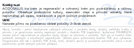 ACIDOSALUS Iris krém je regenerační a ochranný krém pro podrážděnou a citlivou pokožku. Obsahuje probiotické kultury, esenciální oleje a přírodní extrakty, které napomáhají při oparu, bradavicích a jiných kožních problémech.