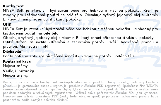 NIVEA Soft je intenzivní hydratační péče pro hebkou a vláčnou pokožku. Krém je vhodný pro každodenní použití na celé tělo. Obsahuje výživný jojobový olej a vitamín E, který chrání přirozenou strukturu pokožky.
