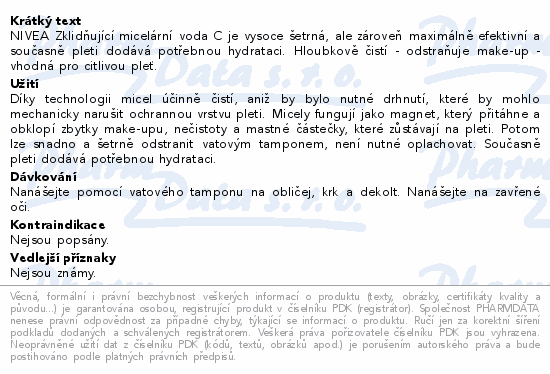 NIVEA Zklidňující micelární voda C je vysoce šetrná, ale zároveň maximálně efektivní a současně pleti dodává potřebnou hydrataci. Hloubkově čistí - odstraňuje make-up - vhodná pro citlivou pleť.