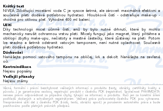NIVEA Zklidňující micelární voda C je vysoce šetrná, ale zároveň maximálně efektivní a současně pleti dodává potřebnou hydrataci. Hloubkově čistí - odstraňuje make-up - vhodná pro citlivou pleť. Výhodné 400 ml balení.