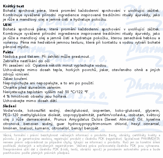 Bohatá sprchová pěna, která promění každodenní sprchování v uvolňující zážitek. Kombinuje vyvážené přírodní ingredience inspirované tradičními rituály ájurvédy, jako je růže a mandlový olej a jemně čistí a hydratuje pokožku.