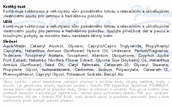 Kombinuje květinovou a velkorysou vůni posvátného lotosu s relaxačními a uklidňujícími vlastnostmi jujuby pro jemnou a hedvábnou pokožku.