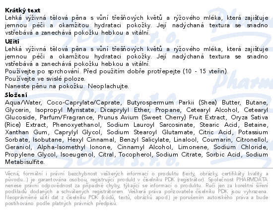 Lehká výživná tělová pěna s vůní třešňových květů a rýžového mléka, která zajišťuje jemnou péči a okamžitou hydrataci pokožky. Její nadýchaná textura se snadno vstřebává a zanechává pokožku hebkou a vitální.