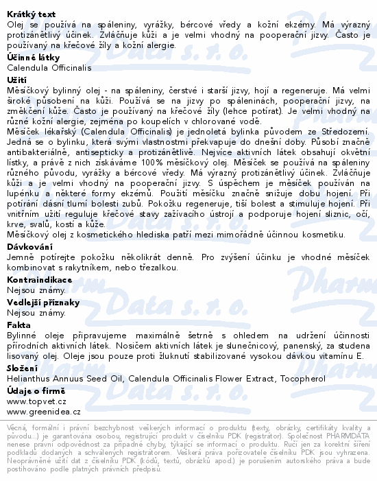 Olej se používá na spáleniny, vyrážky, bércové vředy a kožní ekzémy. Má výrazný protizánětlivý účinek. Zvláčňuje kůži a je velmi vhodný na pooperační jizvy. Často je používaný na křečové žíly a kožní alergie.