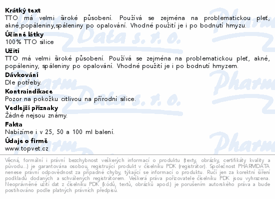 TTO má velmi široké působení. Používá se zejména na problematickou pleť, akné,popáleniny,spáleniny po opalování. Vhodné použití je i po bodnutí hmyzu.