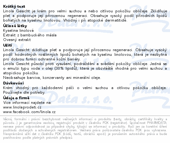 Linola Gesicht je krém pro velmi suchou a nebo citlivou pokožku obličeje. Zklidňuje pleť a podporuje její přirozenou regeneraci. Obsahuje vysoký podíl přírodních lipidů bohatých na kyselinu linolovou. Vhodný i při atopické dermatitidě.