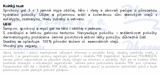 Sprchový gel 3 v 1 jemně myje obličej, tělo i vlasy a zároveň pečuje o přirozenou hydrataci pokožky. Užijte si příjemnou svěží a kořeněnou vůni éterických olejů z eukalyptu, rozmarýnu, litsey cubeby a vetiveru.
