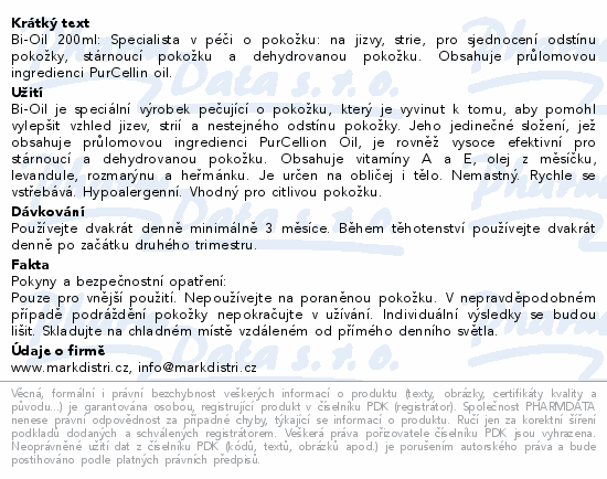 Bi-Oil 200ml: Specialista v péči o pokožku: na jizvy, strie, pro sjednocení odstínu pokožky, stárnoucí pokožku a dehydrovanou pokožku. Obsahuje průlomovou ingredienci PurCellin oil.