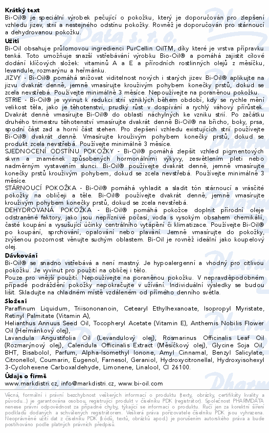 Bi-Oil® je speciální výrobek pečující o pokožku, který je doporučován pro zlepšení vzhledu jizev, strií a nestejného odstínu pokožky. Rovněž je doporučován pro stárnoucí a dehydrovanou pokožku.