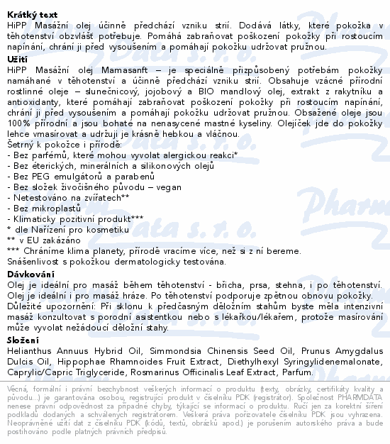 HiPP Masážní olej účinně předchází vzniku strií. Dodává látky, které pokožka v těhotenství obzvlášť potřebuje. Pomáhá zabraňovat poškození pokožky při rostoucím napínání, chrání ji před vysoušením a pomáhají pokožku udržovat pružnou.