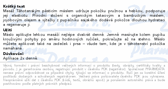 Masáž Těhotenským pěsticím máslem udržuje pokožku pružnou a hebkou, podporuje její elasticitu. Přírodní složení s organickým kakaovým a bambuckým máslem, jojobovým olejem a výtažky z pupečníku asijského dodává pokožce dlouhou hydrataci a regeneruje ji.