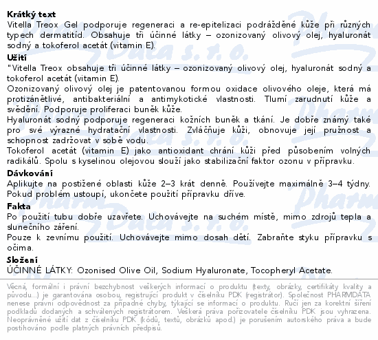 Vitella Treox Gel podporuje regeneraci a re-epitelizaci podrážděné kůže při různých typech dermatitíd. Obsahuje tři účinné látky – ozonizovaný olivový olej, hyaluronát sodný a tokoferol acetát (vitamin E).