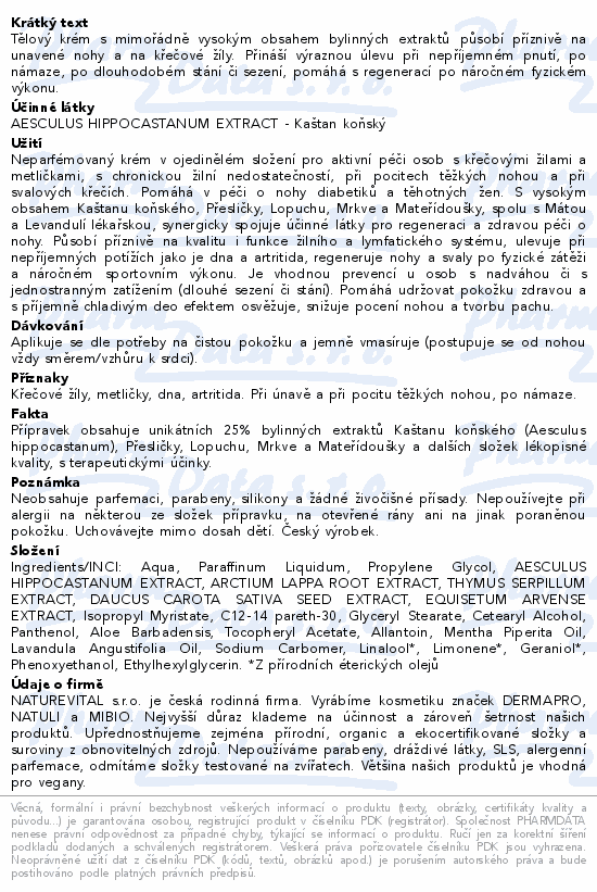 Tělový krém s mimořádně vysokým obsahem bylinných extraktů působí příznivě na unavené nohy a na křečové žíly. Přináší výraznou úlevu při nepříjemném pnutí, po námaze, po dlouhodobém stání či sezení, pomáhá s regenerací po náročném fyzickém výkonu.