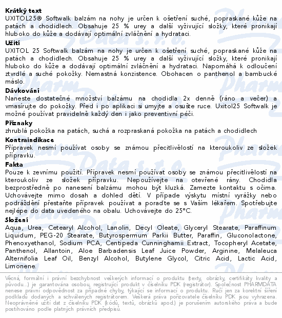 UXITOL25® Softwalk balzám na nohy je určen k ošetření suché, popraskané kůže na patách a chodidlech. Obsahuje 25 % urey a další vyživující složky, které pronikají hluboko do kůže a dodávají optimální zvláčnění a hydrataci.
