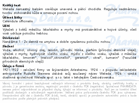 Weleda nemastný balzám osvěžuje unavená a pálicí chodidla. Reguluje nadměrnou tvorbu zrohovatělé kůže a omezuje pocení nohou.