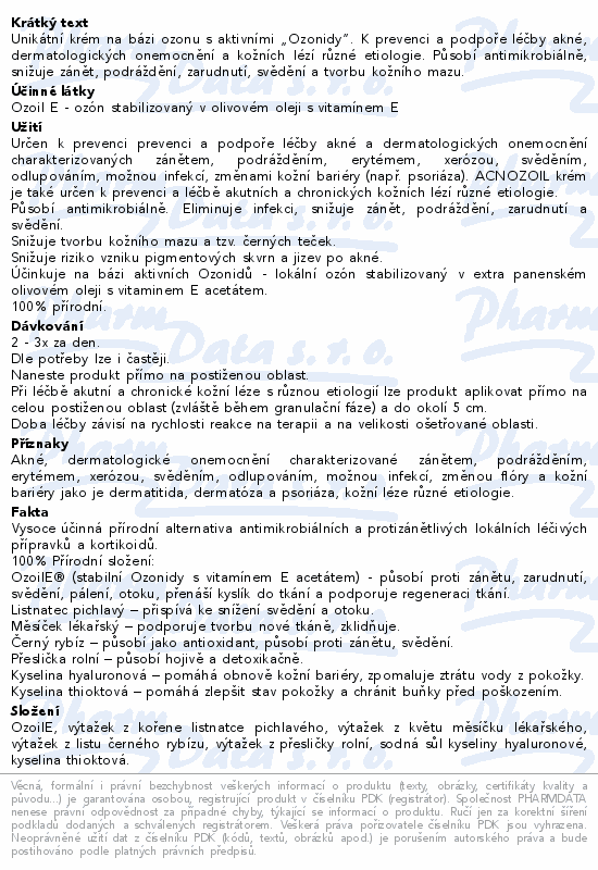 Unikátní krém na bázi ozonu s aktivními „Ozonidy“. K prevenci a podpoře léčby akné, dermatologických onemocnění a kožních lézí různé etiologie. Působí antimikrobiálně, snižuje zánět, podráždění, zarudnutí, svědění a tvorbu kožního mazu.