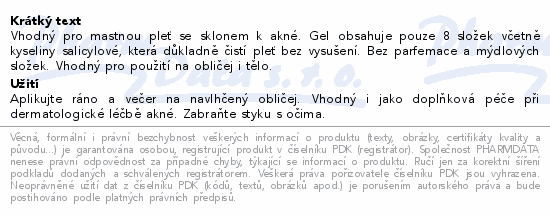 Vhodný pro mastnou pleť se sklonem k akné. Gel obsahuje pouze 8 složek včetně kyseliny salicylové, která důkladně čistí pleť bez vysušení. Bez parfemace a mýdlových složek. Vhodný pro použití na obličej i tělo.