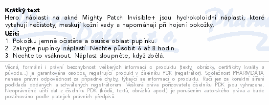 Hero. náplasti na akné Mighty Patch Invisible+ jsou hydrokoloidní náplasti, které vytahují nečistoty, maskují kožní vady a napomáhají při hojení pokožky.