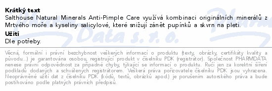 Salthouse Natural Minerals Anti-Pimple Care využívá kombinaci originálních minerálů z Mrtvého moře a kyseliny salicylové, které snižují zánět pupínků a skvrn na pleti.
