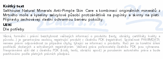 Salthouse Natural Minerals Anti-Pimple Skin Care s kombinací originálních minerálů z Mrtvého moře a kyseliny salicylové působí protizánětlivě na pupínky a skvrny na pleti. Přípravky zachovávají vlastní ochrannou bariéru pokožky.