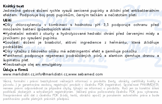 Jedinečné gelové složení rychle vysuší zanícené pupínky a zklidní pleť antibakteriálním efektem. Podporuje boj proti pupínkům, černým tečkám a nečistotám pleti.