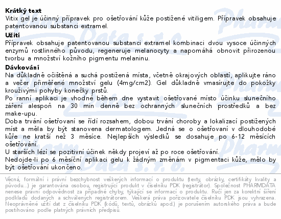 Vitix gel je účinný přípravek pro ošetřování kůže postižené vitiligem. Přípravek obsahuje patentovanou substanci extramel.