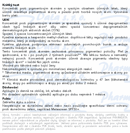 Koncentrát proti pigmentovým skvrnám s vysokým obsahem účinných látek, který účinně zesvětluje pigmentové skvrny a působí proti tvorbě nových skvrn. Vyrovnává barvu pleti.