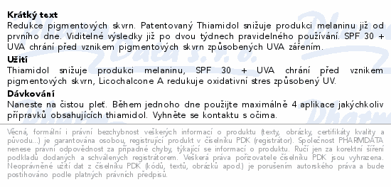Redukce pigmentových skvrn. Patentovaný Thiamidol snižuje produkci melaninu již od prvního dne. Viditelné výsledky již po dvou týdnech pravidelného používání. SPF 30 + UVA chrání před vznikem pigmentových skvrn způsobených UVA zářením.