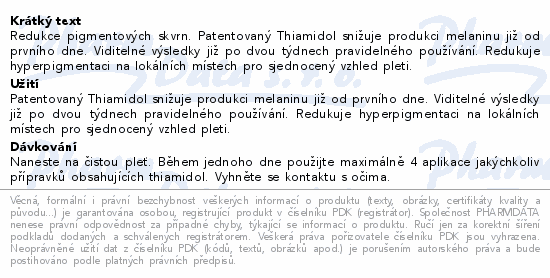 Redukce pigmentových skvrn. Patentovaný Thiamidol snižuje produkci melaninu již od prvního dne. Viditelné výsledky již po dvou týdnech pravidelného používání. Redukuje hyperpigmentaci na lokálních místech pro sjednocený vzhled pleti.