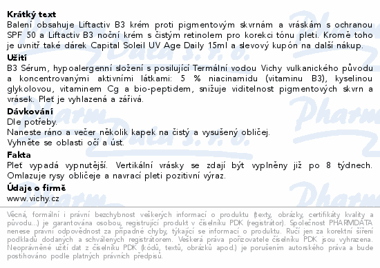 Balení obsahuje Liftactiv B3 krém proti pigmentovým skvrnám a vráskám s ochranou SPF 50 a Liftactiv B3 noční krém s čistým retinolem pro korekci tónu pleti. Kromě toho je uvnitř také dárek Capital Soleil UV Age Daily 15ml a slevový kupón na další nákup.