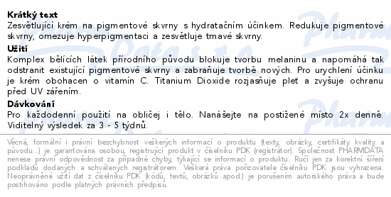 Zesvětlující krém na pigmentové skvrny s hydratačním účinkem. Redukuje pigmentové skvrny, omezuje hyperpigmentaci a zesvětluje tmavé skvrny.