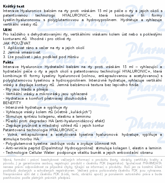 Intensive Hyaluronic+ balzám na rty proti vráskám 15 ml je péče o rty a jejich okolí s patentovanou technologií HYALURONIC+, která kombinuje tři formy kyselin-hyaluronovou s polyglutamovvou a hydroxyprolinem. Hydratuje a vyhlazuje vertikální vrásky rtů.