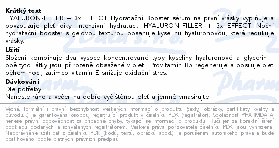 HYALURON-FILLER + 3x EFFECT Hydratační Booster sérum na první vrásky vyplňuje a povzbuzuje pleť díky intenzivní hydrataci. HYALURON-FILLER + 3x EFFECT Noční hydratační booster s gelovou texturou obsahuje kyselinu hyaluronovou, která redukuje vrásky.
