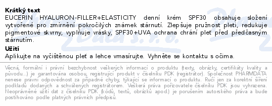 EUCERIN HYALURON-FILLER+ELASTICITY denní krém SPF30 obsahuje složení vytvořené pro zmírnění pokročilých známek stárnutí. Zlepšuje pružnost pleti, redukuje pigmentové skvrny, vyplňuje vrásky, SPF30+UVA ochrana chrání pleť před předčasným stárnutím.