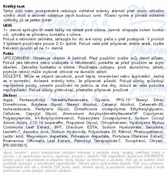 Tento oční krém prokazatelně redukuje viditelné známky stárnutí pleti okolo citlivého očního okolí a zároveň oddaluje jejich budoucí vznik. Působí rychle a přináší viditelné výsledky již za jeden týden.