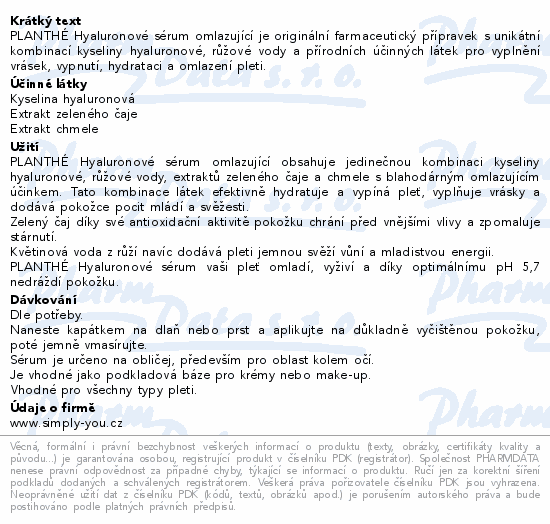 PLANTHÉ Hyaluronové sérum omlazující je originální farmaceutický přípravek s unikátní kombinací kyseliny hyaluronové, růžové vody a přírodních účinných látek pro vyplnění vrásek, vypnutí, hydrataci a omlazení pleti.