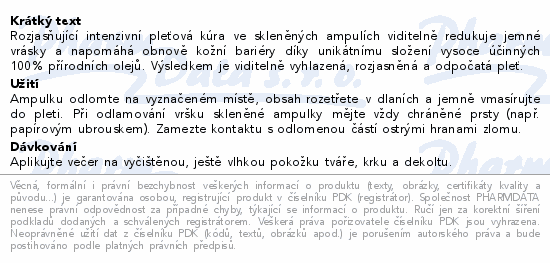 Rozjasňující intenzivní pleťová kúra ve skleněných ampulích viditelně redukuje jemné vrásky a napomáhá obnově kožní bariéry díky unikátnímu složení vysoce účinných 100% přírodních olejů. Výsledkem je viditelně vyhlazená, rozjasněná a odpočatá pleť.