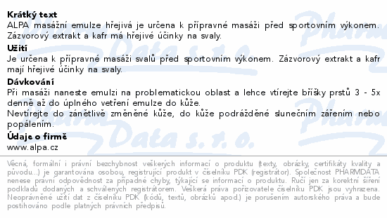 ALPA masážní emulze hřejivá je určena k přípravné masáži před sportovním výkonem. Zázvorový extrakt a kafr má hřejivé účinky na svaly.