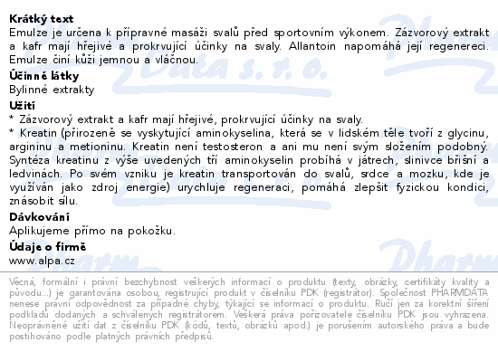 Emulze je určena k přípravné masáži svalů před sportovním výkonem. Zázvorový extrakt a kafr mají hřejivé a prokrvující účinky na svaly. Allantoin napomáhá její regenereci. Emulze činí kůži jemnou a vláčnou.